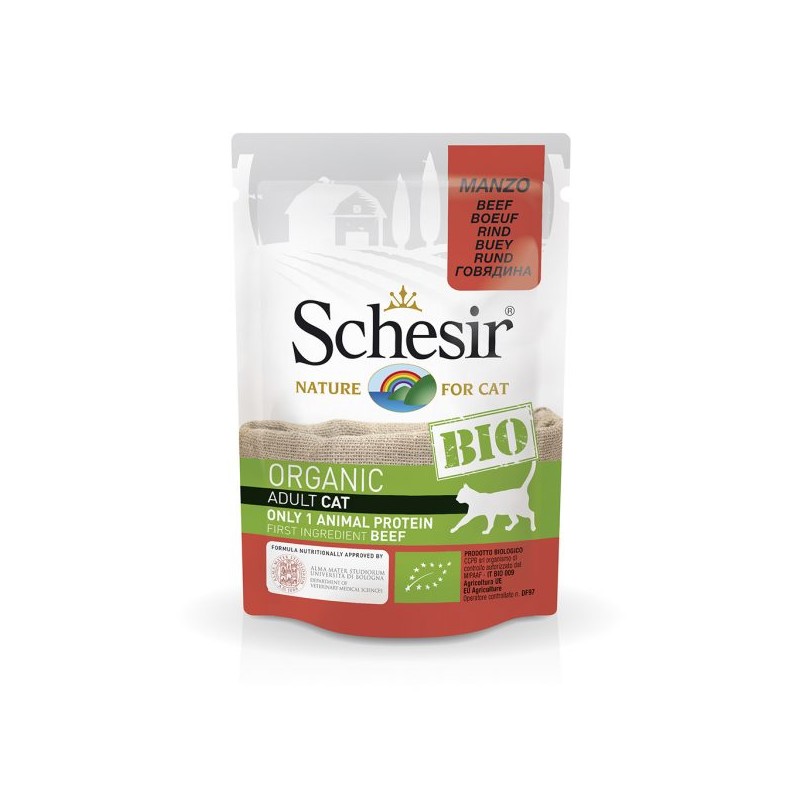 Schesir ofrece a tu gato una receta a base de buey ecológico: estas carnes, que se utilizan como ingrediente principal, están enriquecidas con sabrosos calabacines. La receta está formulada sin cereales. Un delicioso paté BIO con el que puedes ofrecer una comida completa, equilibrada y llena de sabor.