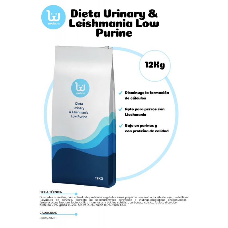 Dieta veterinaria para perros con leishmania, efectiva para problemas urinarios y renales. Pienso con bajo contenido en purinas. Formulado a base de guisantes, arroz y proteinas vegetales. Favorece la no formación de cálculos.